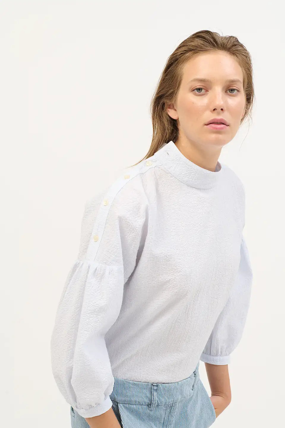 Cuello alto abotonado en ambos lados en el cuello y en un lado en el hombro