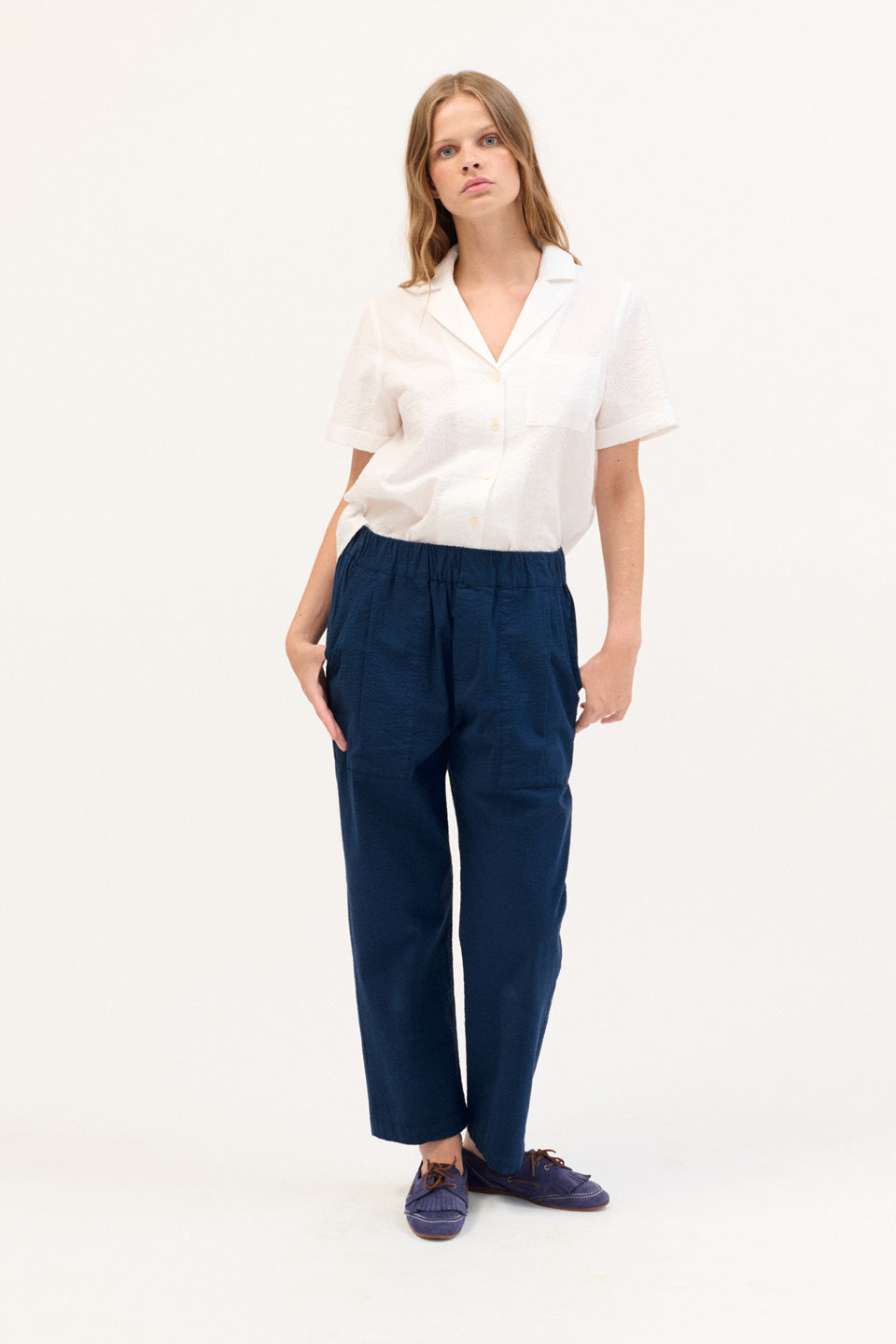 Pantalón seersucker recto de fit regular y tiro alto