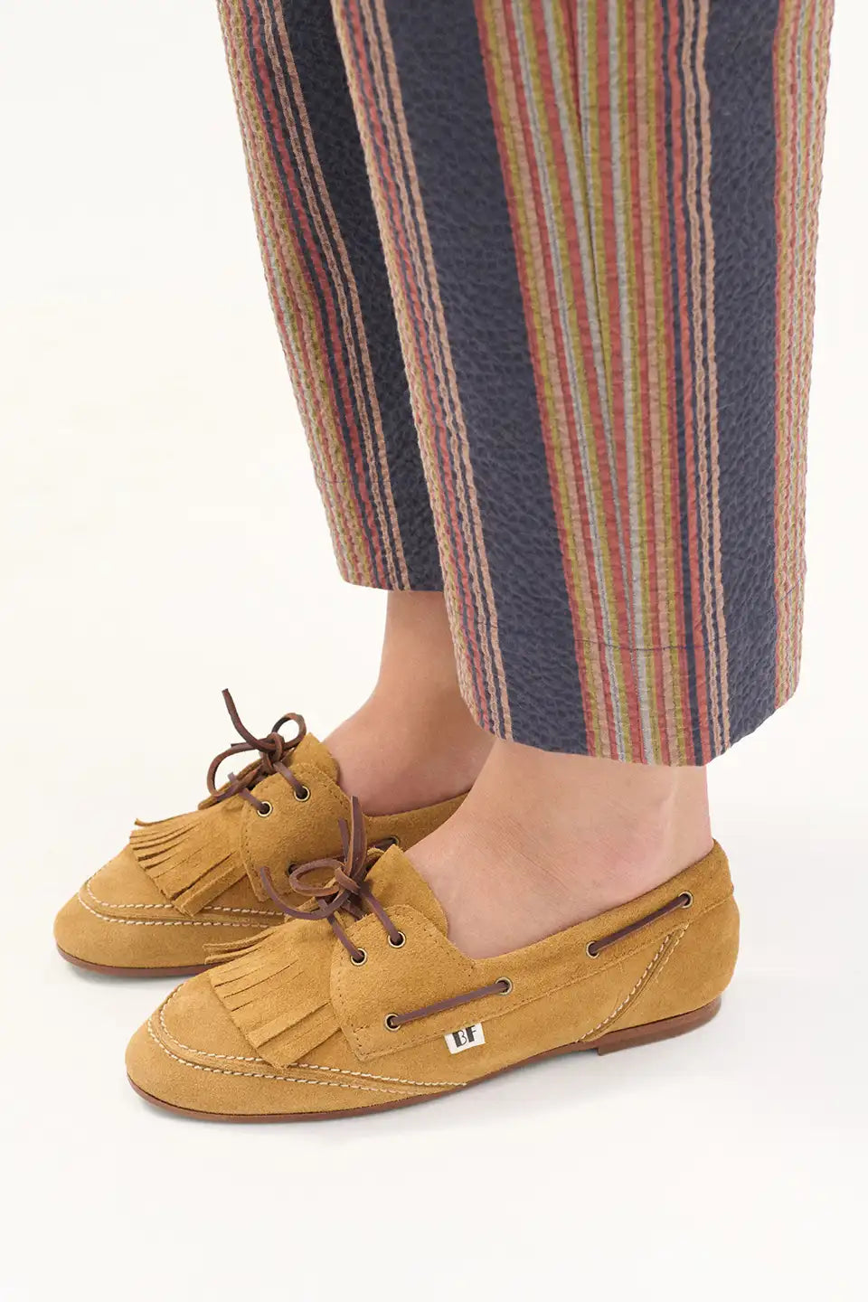 Diseño tipo náutico con flecos y pespuntes decorativos en la parte delantera y trasera