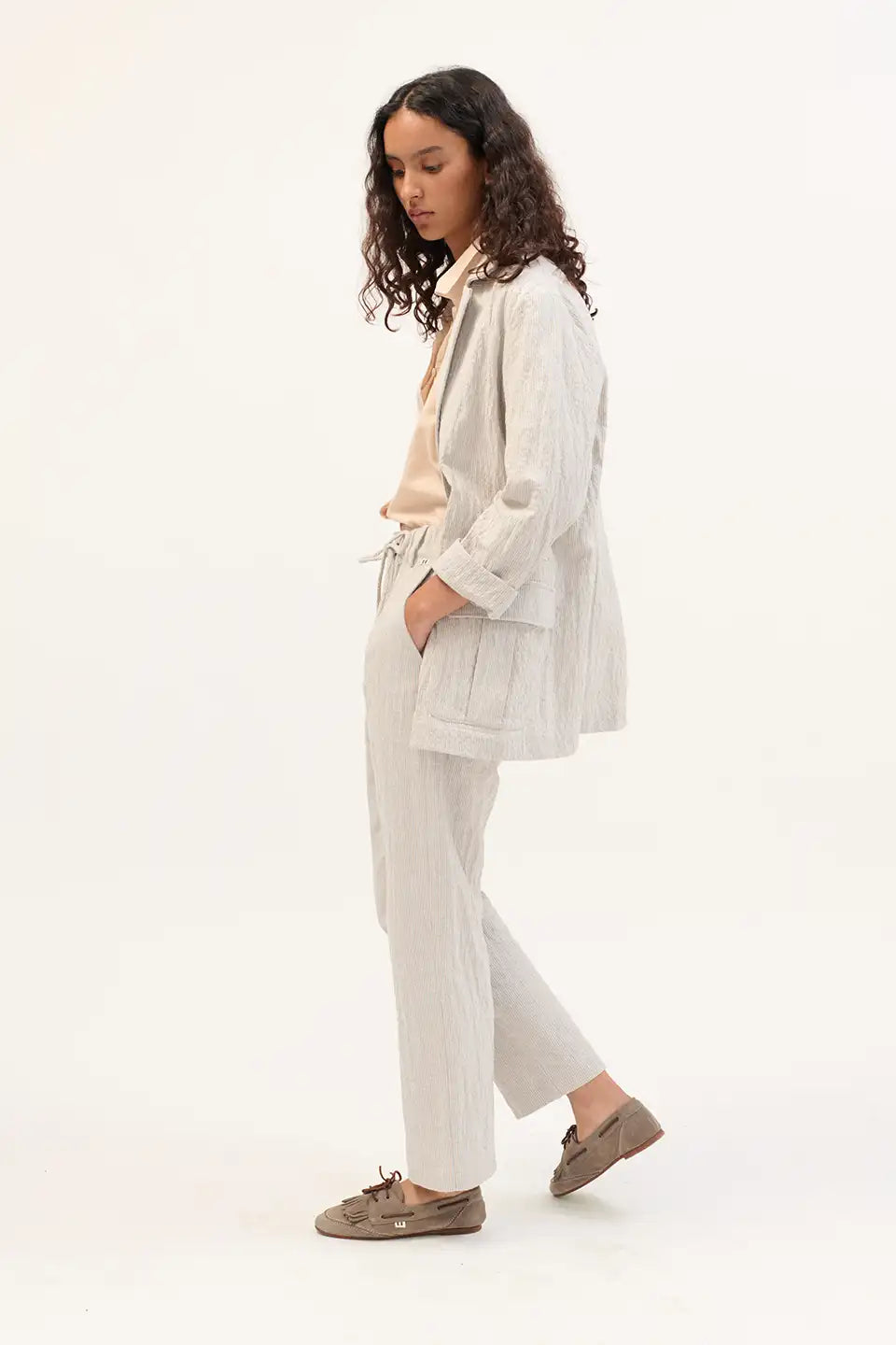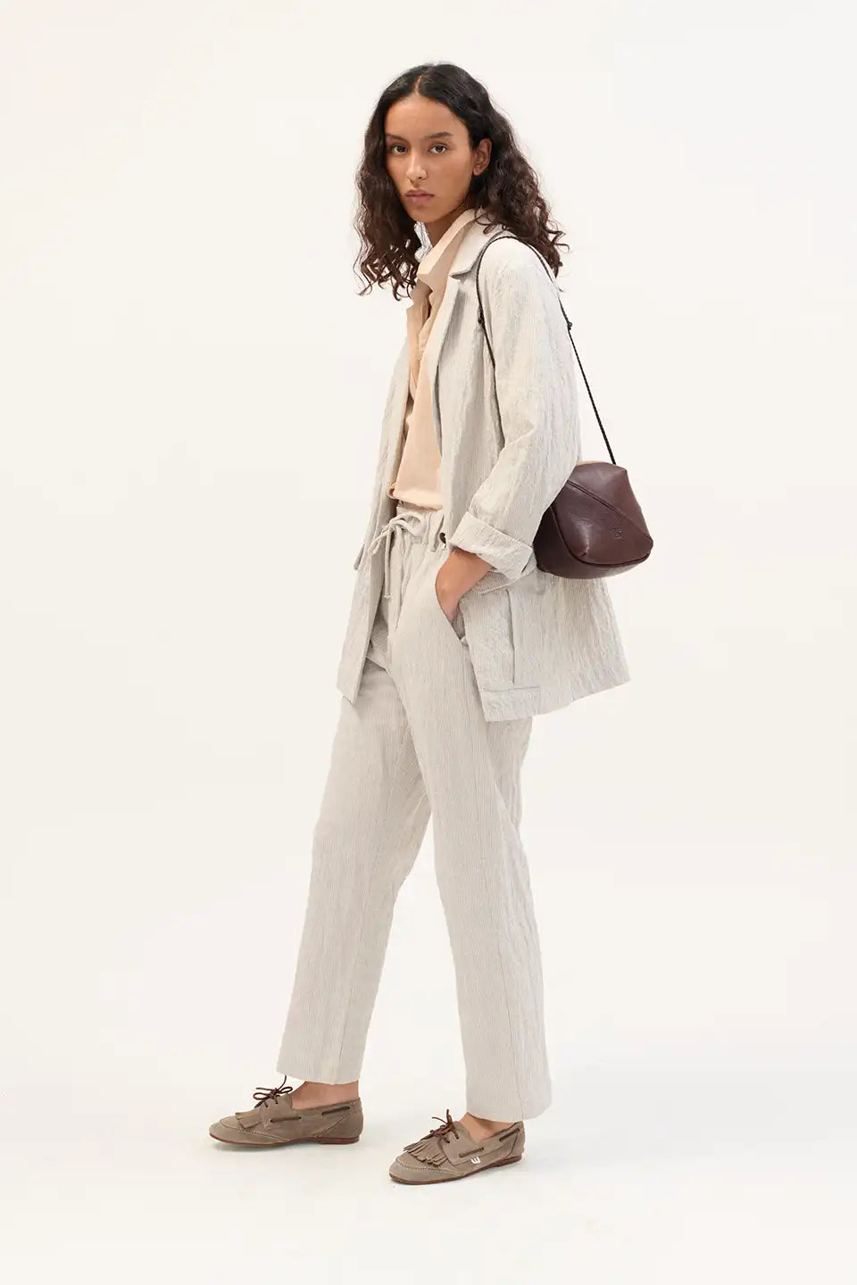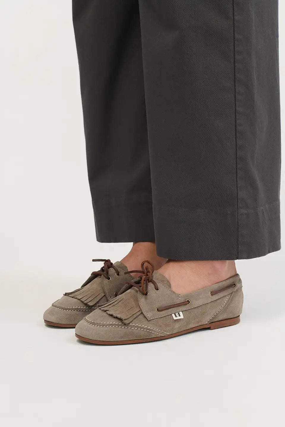 Diseño tipo náutico con flecos y pespuntes decorativos en la parte delantera y trasera